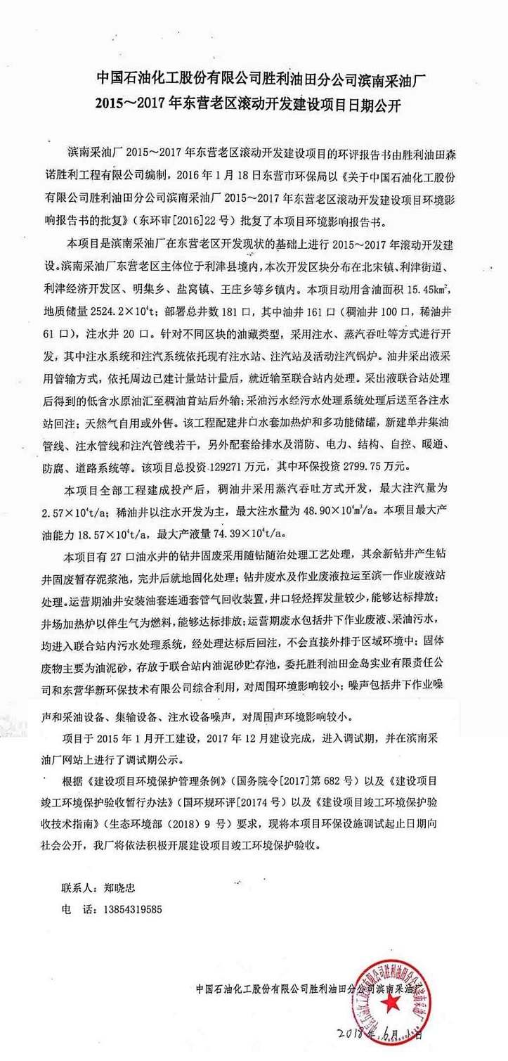 中國石油化工股份有限公司勝利油田分公司濱南采油廠2015~2017年東營老區滾動開發建設項目日期公開