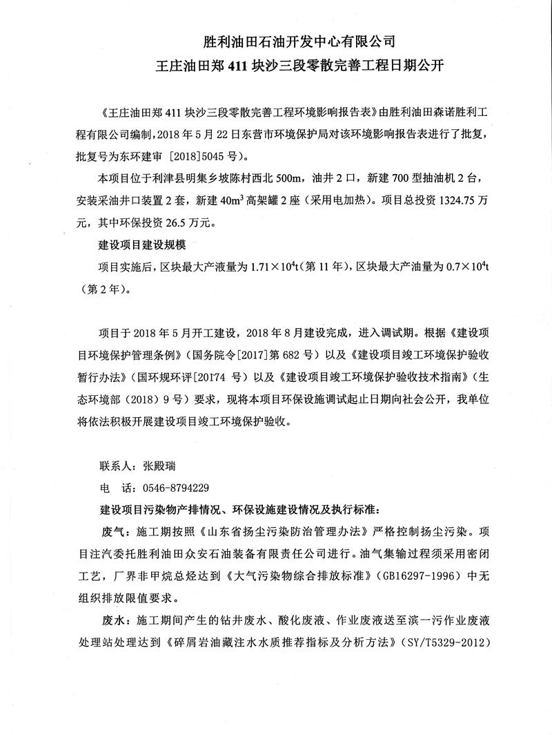 勝利油田石油開發中心有限公司王莊油田411塊沙三段零散完善工程日期公開