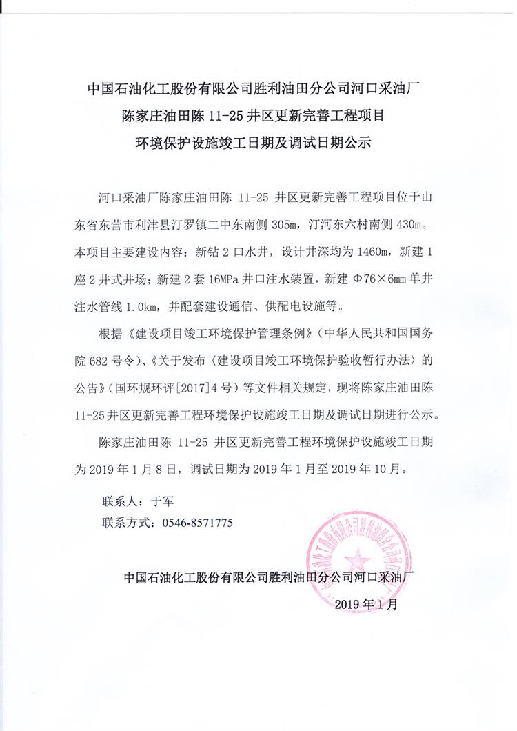 中國石油化工股份有限公司勝利油田分公司河口采油廠陳家莊油田陳11-25井區(qū)更新完善工程項目 環(huán)境保護設施竣工日期及調(diào)試日期公示