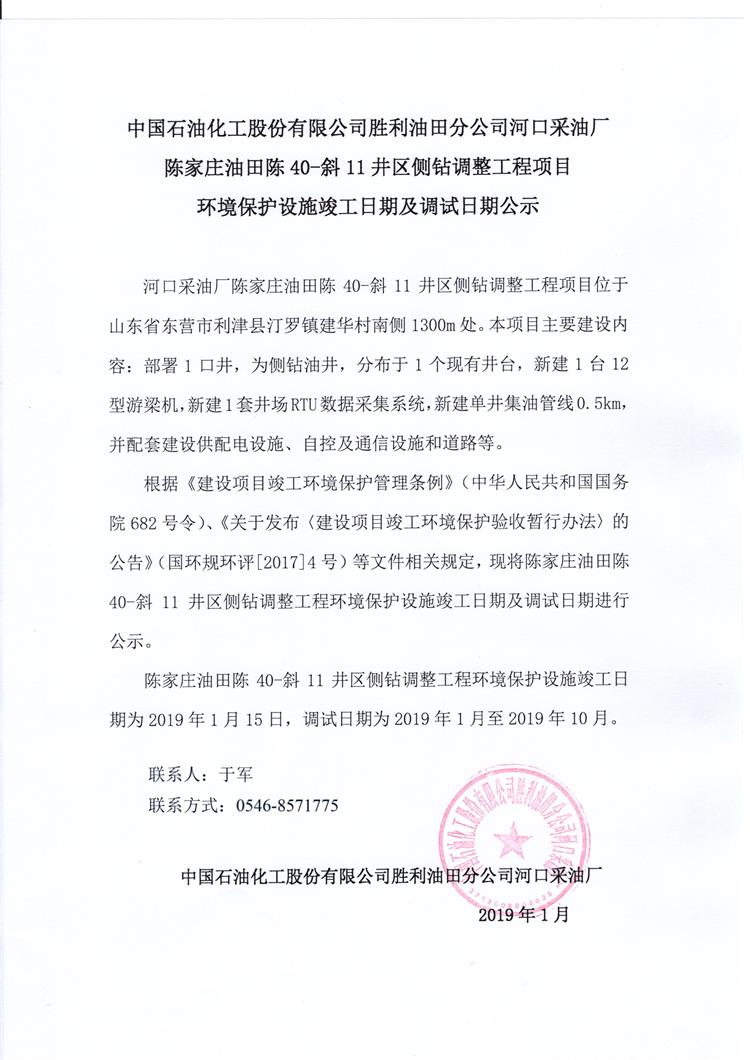 中國石油化工股份有限公司勝利油田分公司河口采油廠陳家莊油田陳40-斜11井區側鉆調整工程項目 環境保護設施竣工日期及調試日期公示